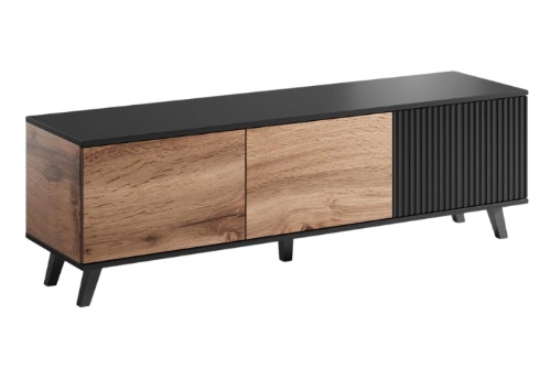 Тумба ТВ состоит из трех распашных фасадов, за которыми можно удобно хранить электронику, документы и другие предметы. Модель отличается рифленым фасадом, глубокий черный цвет которого идеально сочетается с теплым оттенком дуба вотан.